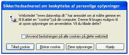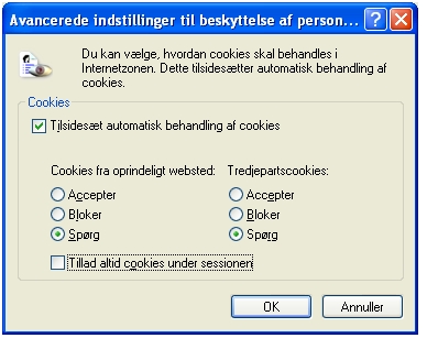 Denne indstilling betyder, at du altid vil blive spurgt, hver gang en hjemmeside bruger en såkaldt "cookie". Hvis du ikke vil have spørgsmålet hver gang, kan du i stedet for "Spørg" vælge "Accepter" når du markerer felterne under "Avanceret".